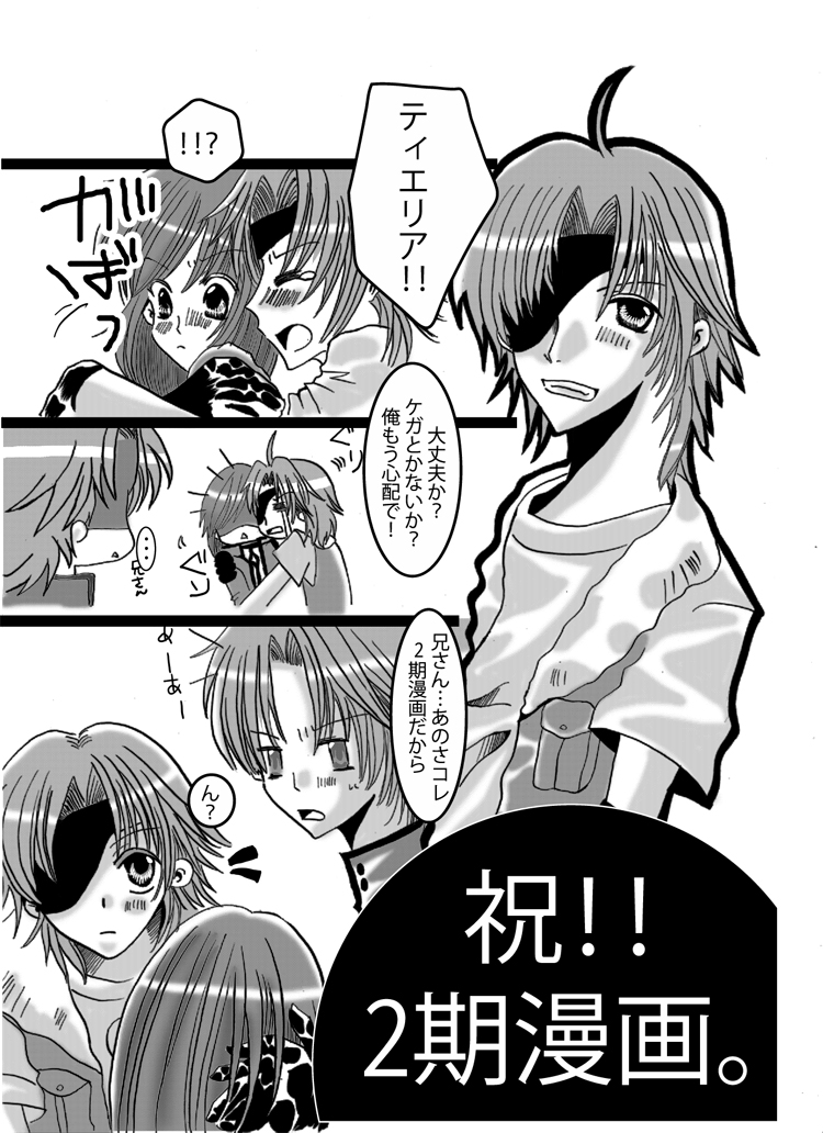 ロクティエオンリーお疲れ様でした! 最近私生活(主に仕事)に忙しく 挨拶に行きたいのに行けない状態です… あああああああ~;;;;すみません…orz でコソリと4話感想。 ライルが射撃のシュミレーション訓練してる 場面に変わった時即座に可愛い教官殿はどこかしら♪ と思った私は心底腐っているようです(笑) 後スメラギさんとミレイナたん、マリナ姫と 女の子が可愛くてムフフとなりましたよ~(変態★) そして19日に配ったペーパー漫画をコソリとUPです。 19日お品書き。 |